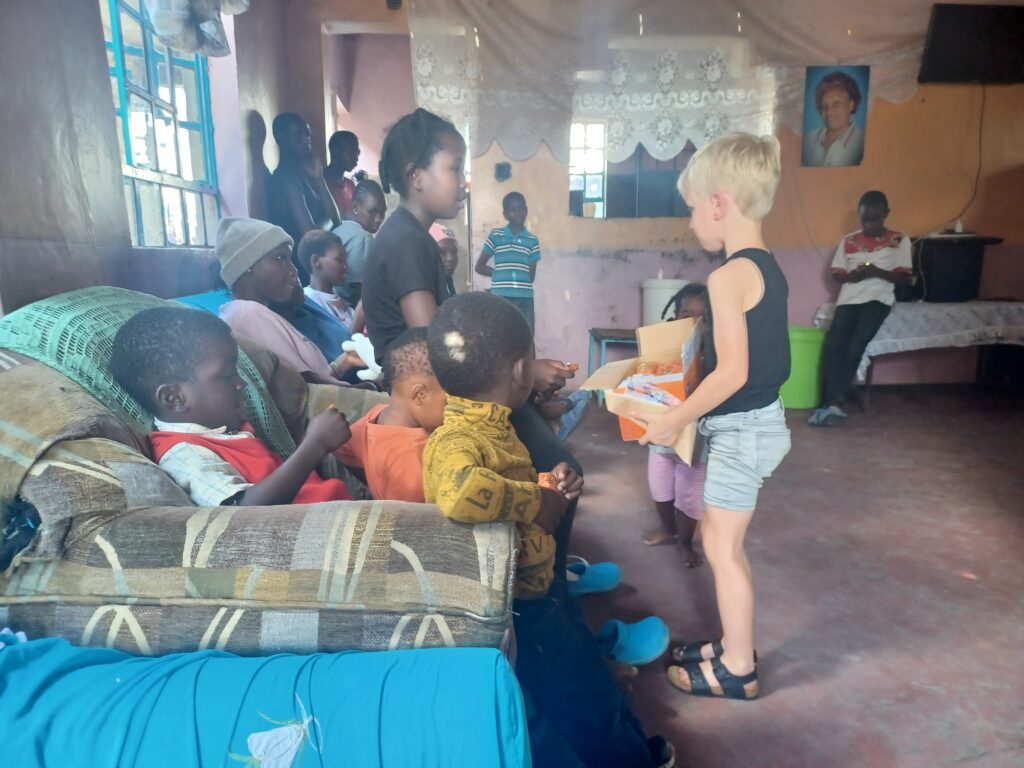 Afgelopen jaar waren wij met ons gezin in Kenia. Daar hebben we ook het weeshuis in Ruai bezocht. Het was in de meivakantie en had ontzettend veel geregend. Het was spannend of we er konden komen, want sommige wegen waren niet meer begaanbaar door het vele water. Met behulp van locals, die een goede route wisten en die onze auto een duwtje door de modder of het water konden geven, is het toch gelukt. Daar aangekomen werden we indrukwekkend onthaald. Alle kinderen kwamen naar de ontmoetingsruimte en daar werd uit volle borst voor ons gezongen. Wat kunnen de kinderen met volume zingen en ook zo enthousiast! Ook kwam er een voorstelronde waarin alle kinderen aangaven op welke school ze zaten en in welke groep. Wij hadden vervolgens een lekkere traktatie meegenomen (chips, popcorn en drinken) en daarnaast nog wat speelgoed van onze kinderen. Wat een feestje!